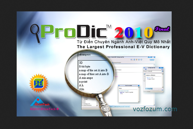 Từ điển chuyên nghành Anh-Việt Prodic 2010 là sản phẩm được phát triển bởi công ty EConTech là một bộ từ điển phong phú về tính thông dụng, chuyên nghành kỹ thuật và chuyên ngành kinh tế. Với Prodic 2010 Full Prodic 2010 Full nó sẽ đáp ứng đầy đủ yêu cầu tra cứu trong kỹ thuật kinh tế thương mại trong giai đoạn thế giới đang mửa cửa hội nhập & giao lưu quốc tế hiện nay.